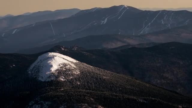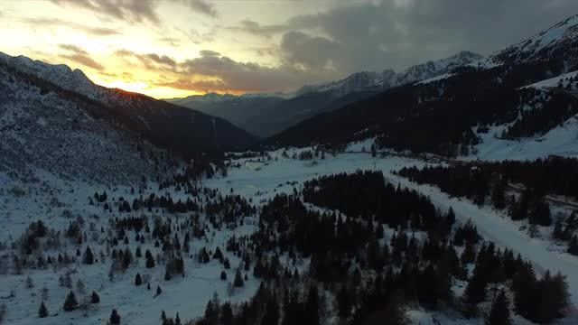 Flying over the area of ski centre located in Khibins. Wooden buildings, vast snowfields and hills at golden sunset. Russian north