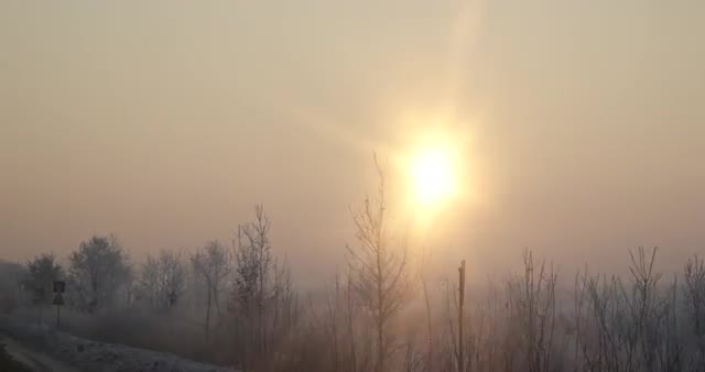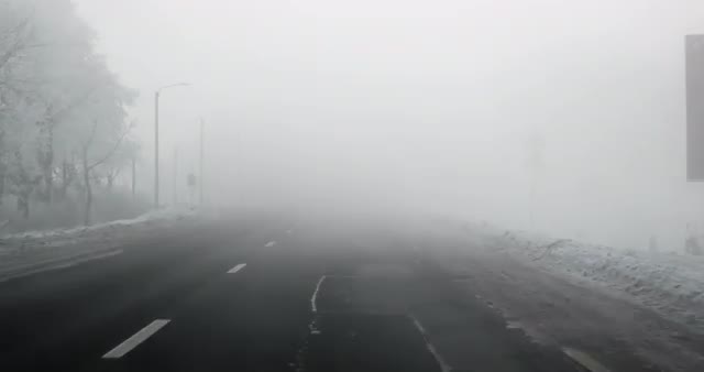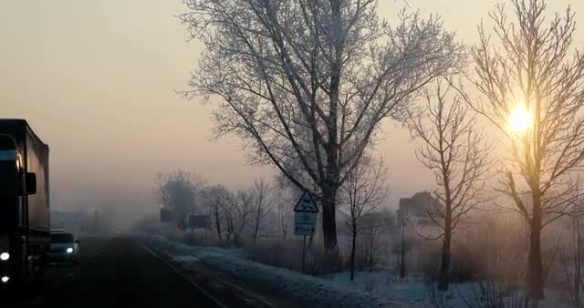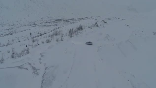 Aerial shot of the driving on winter snowy road in the countryside, back view