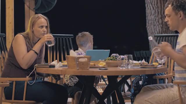 Hyperlapse shot of parents and little son holding hands and walking along vibrant night street, passing by outdoor cafes and stores
