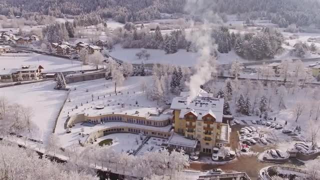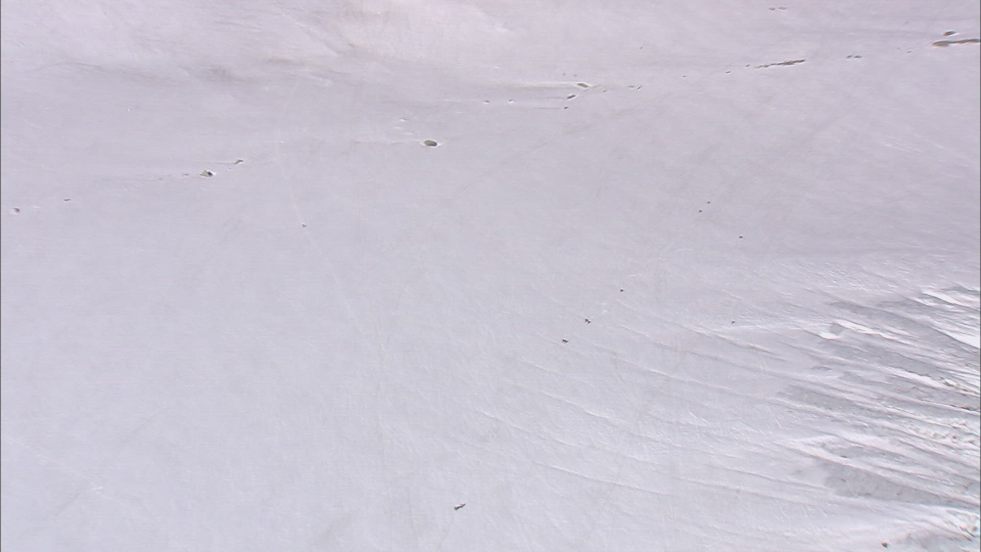 Flying over the working empty ski lift and lampposts along the hillside in the evening, few people skiing in the distance