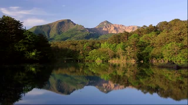 > Morning view of Goshiki-numa pond and Mount Bandai, Fukushima Prefecture, Japan
