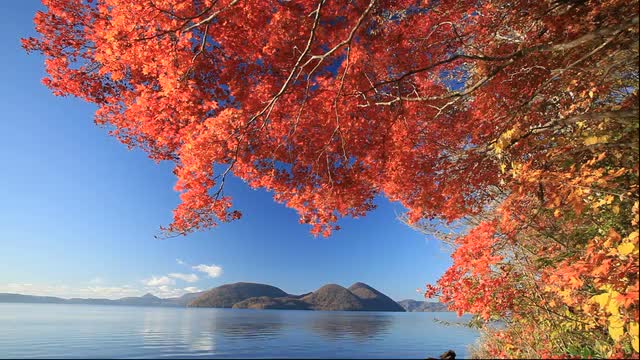 > Autumn view of Lake Toya and Nakajima Island, Hokkaido, Japan