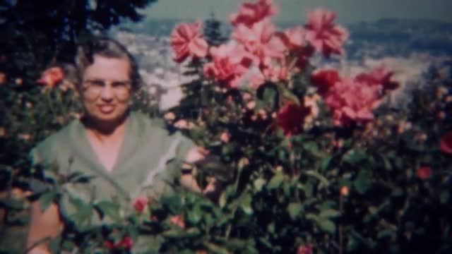 455460 - 1959: Original Portlander gardener admires pink rose bush flowers.