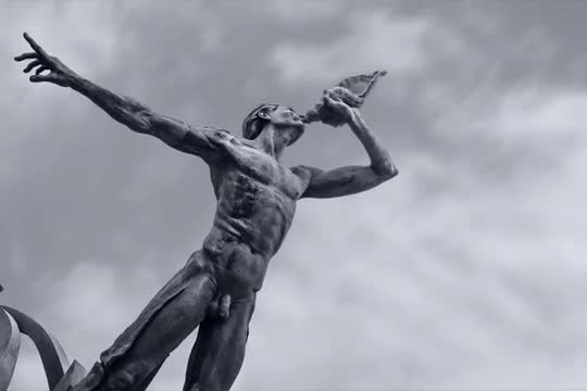 Motion Controlled Dolly B&W Timelapse shot of the Trito statue (sculpture) against the sky in Gran Canaria, Spain, composited, high-contrast, art, heritage