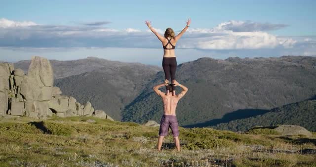 Couple does yoga on cliff side in slow motion.