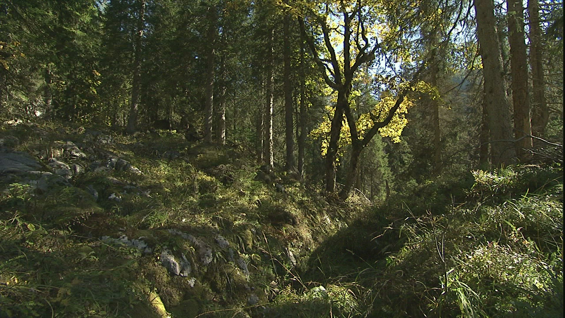 MS Photographer walking around colorful trees on windy day / EL Chalten, Patagonia, Argentina