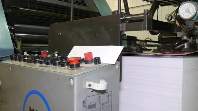 Control panel, worker of publishing house stops printing press pushing button. Pan shot. 4K Ultra HD.