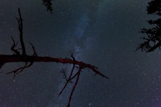 Motion Controlled Wide Angle Timelapse shot of a dark starry sky and Milky Way in a remote, light pollution free countryside. Tree silhouette in the foreground.