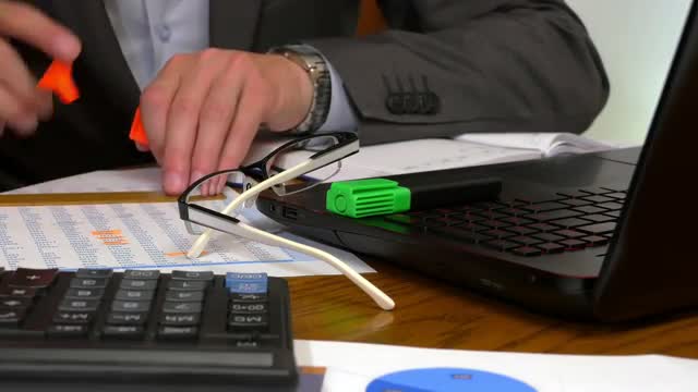 Hands of classically dressed man type on laptop, highlight information in document with orange marker, put on glasses and start writing in note book. Close up. 4K Ultra HD.