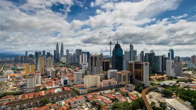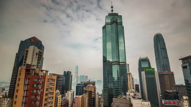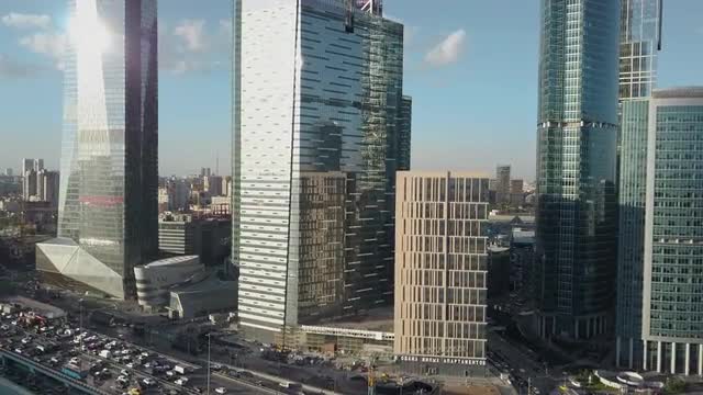 Corporate Buildings, Blue Sky and Clouds Mirrored in Skyscraper. Zoom Out.