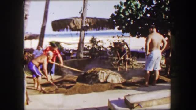 1958: Pig roast Hawaiian luau shoveling dirt burying food at hotel resort. HONOLULU, HAWAII