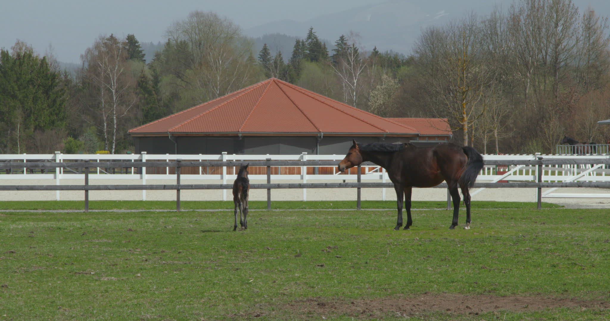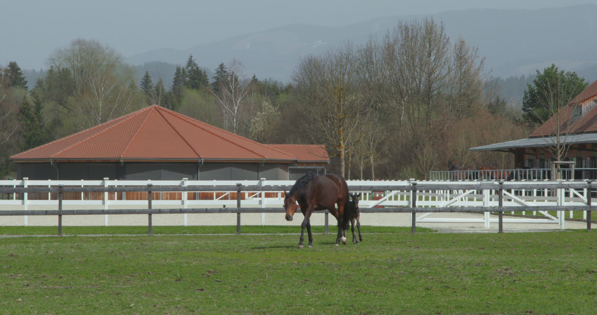 Slow motion shot of a horse with a foal in the pasture