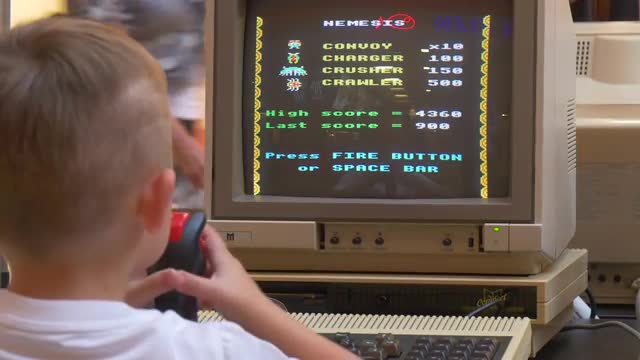 Wroclaw/poland - Jun 18 2016: the Little Boy Plays an Old Computer Game During the Festival of Old Computer Games in Wroclaw (Poland). he Controls a Small Spaceship With Help of a Joystick. Evil Aliens is Attacked Spaceship of the Boy.