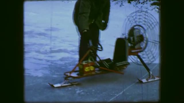 > 1961: Man starting fan hovercraft ski vehicle over winter frozen ice pond. BUFFALO, NEW YORK
