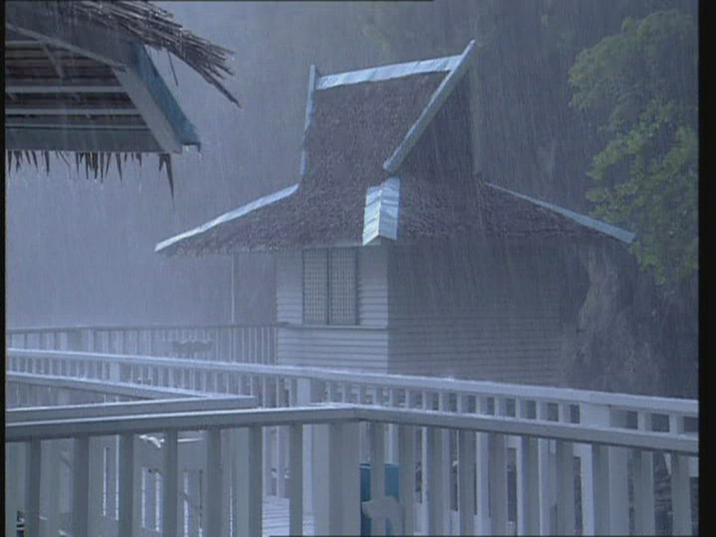 Slow motion shot of a heavy rain falling on the edge of a roof
