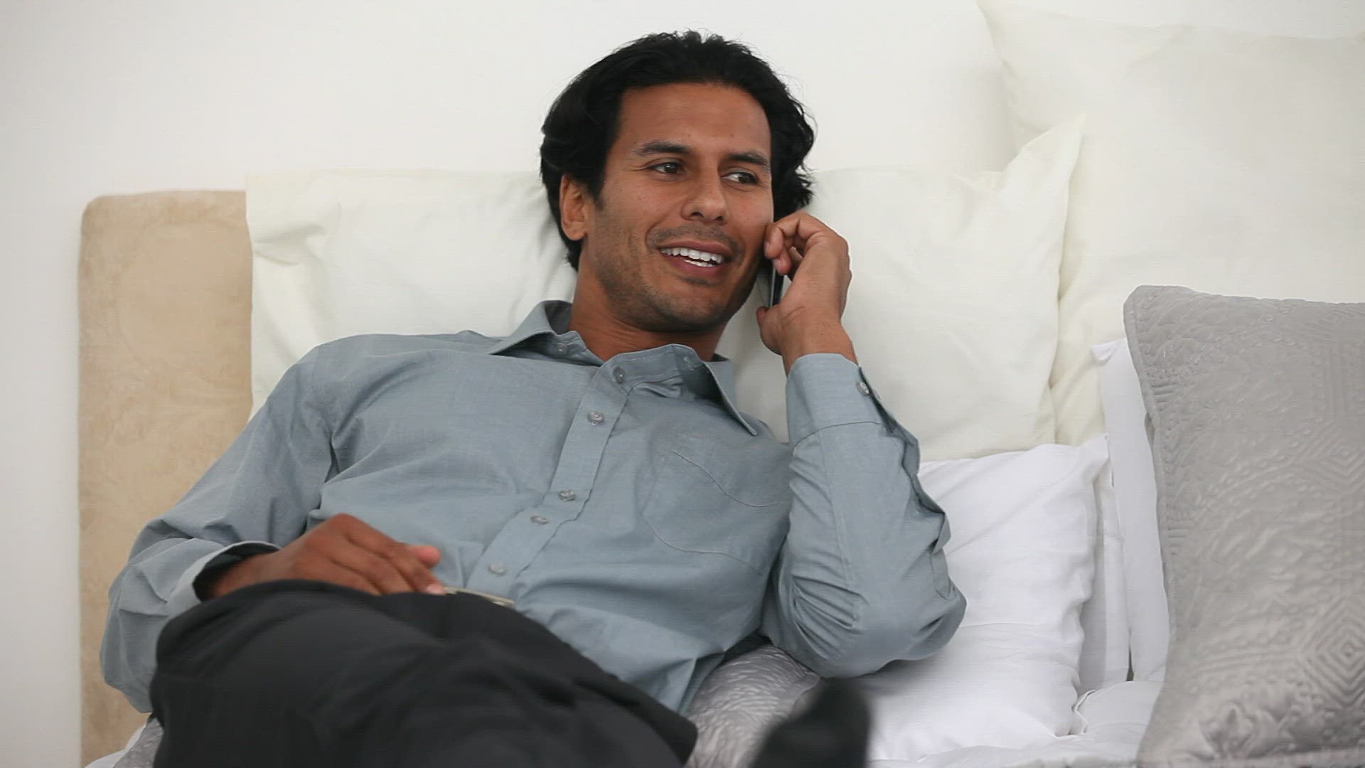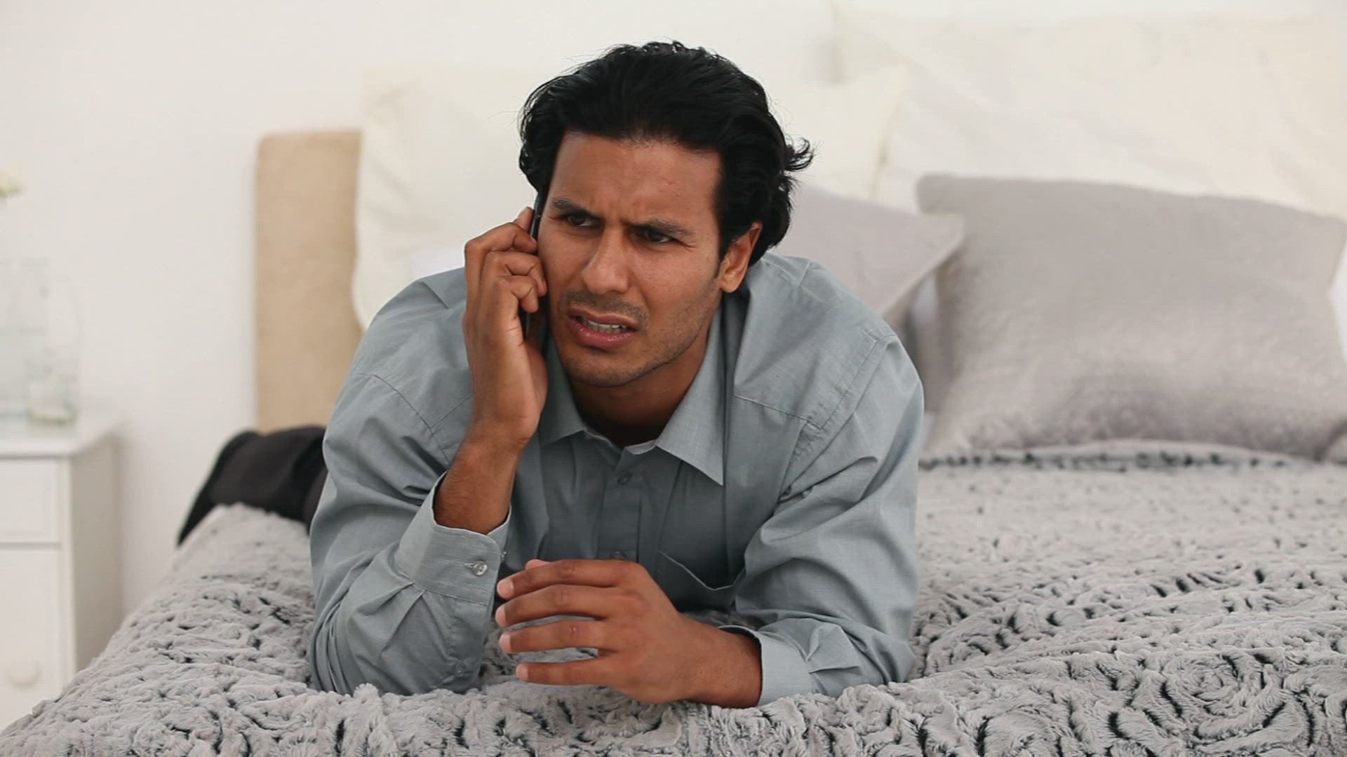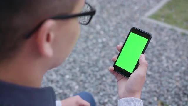 Mature man is typing in smartphone, setting sun over the calm sea is on the background.