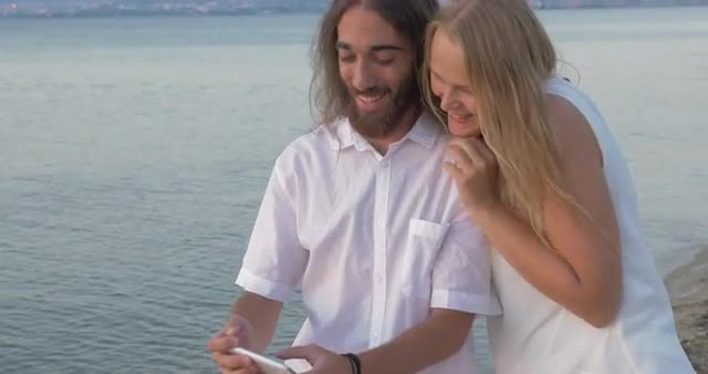 Mature couple resting on beach loungers taking selfie at smartphone and watching the results.