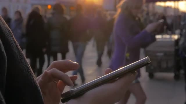View to the sunset over sea with following close-up shot of woman using smartwatch and setting home city