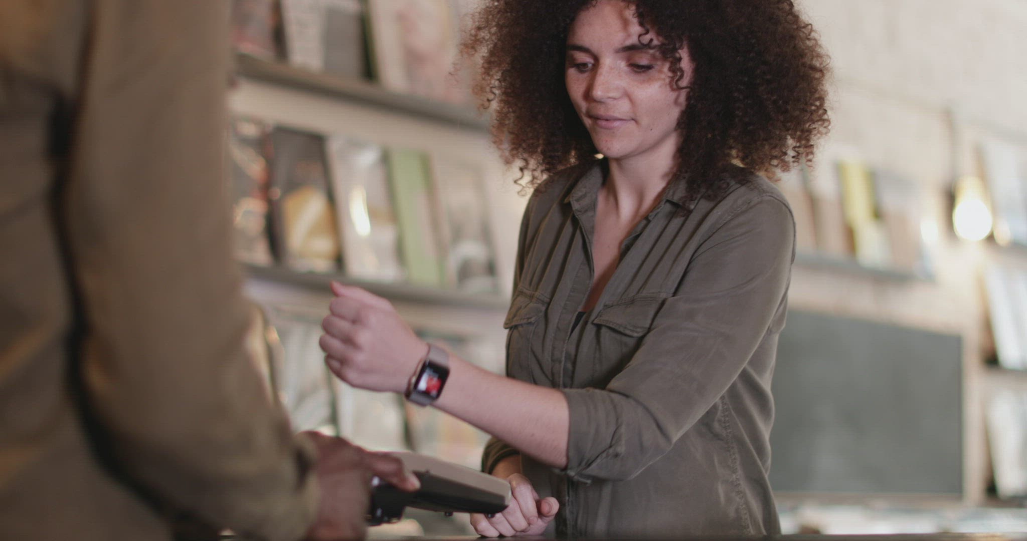 Senior couple using smart watch sitting in beach cafe in the evening. Man touching screen with pen and showing something to cheerful woman
