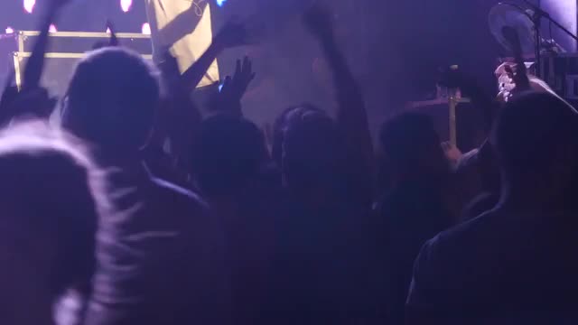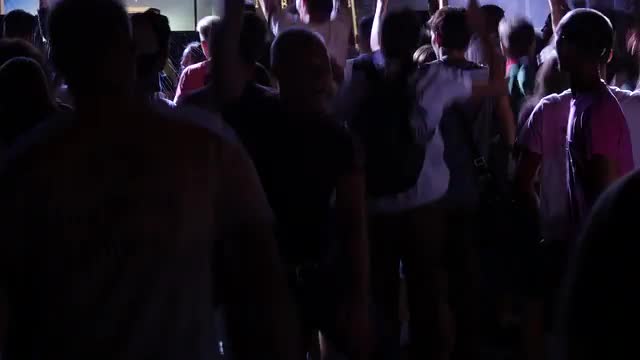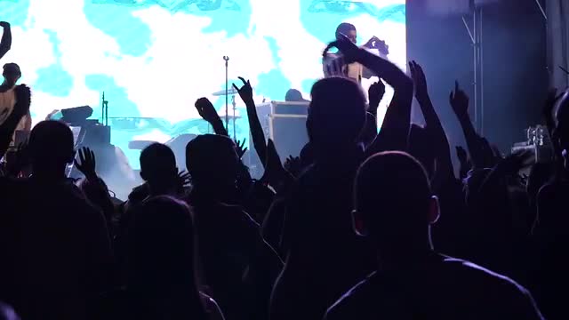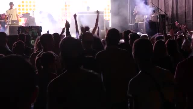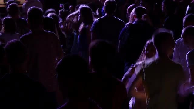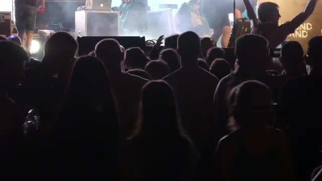 UKRAINE, VINNITSA - AUGUST 10, 2016: silhouettes of concert crowd in front of bright stage lights
