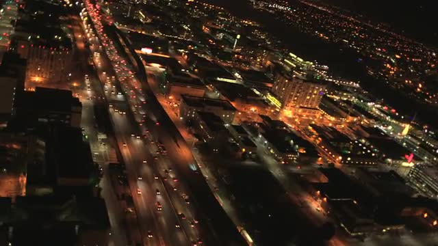 Aerial night view of the Port of Oakland, San Francisco Bay, USA