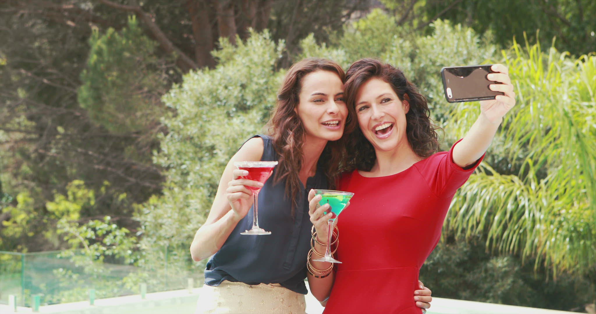 Young blond woman with smart phone taking picture of cocktail with sparkler and then making selfie with it. When fire going down she having a drink