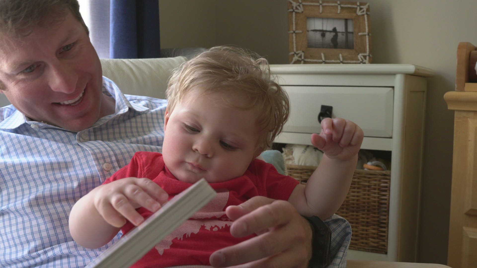 Young father reading a book to the little son. Child sitting in the arm-chair on the balcony and interacting with dad