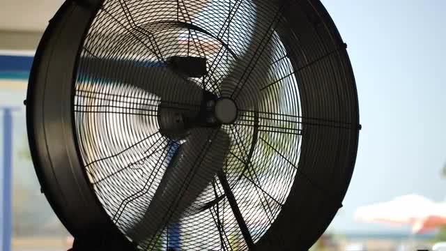 Industrial fan metal shutters opening. Opening of industrial ventilation. Cooling air in industry. Blower behind metal grille. Industrial equipment. Power conditioner blow warm air