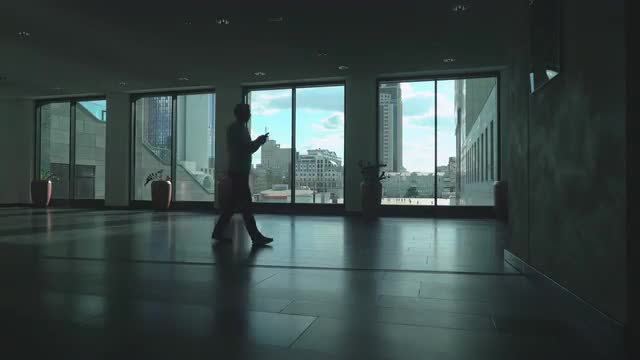 Male athletic appearance is dark corridor with large windows looking into the phone. Office building. Outside seen as pedestrians walk.