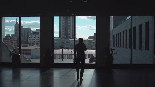 Athletic man in a dark hallway speaks on the phone, looking at the box office. Standing with his back to the camera.