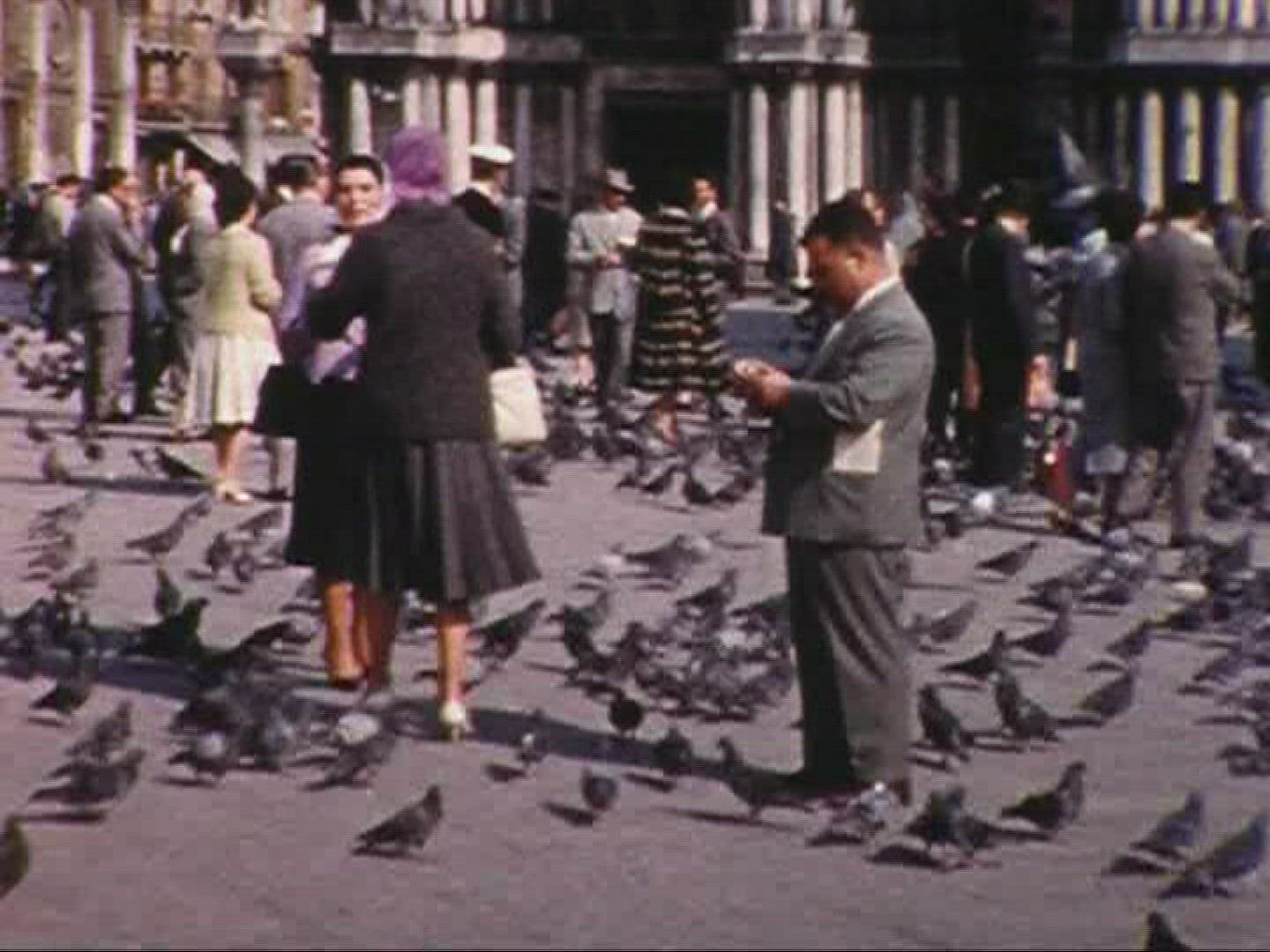 > Flock of pigeons flying on the city square in Paris