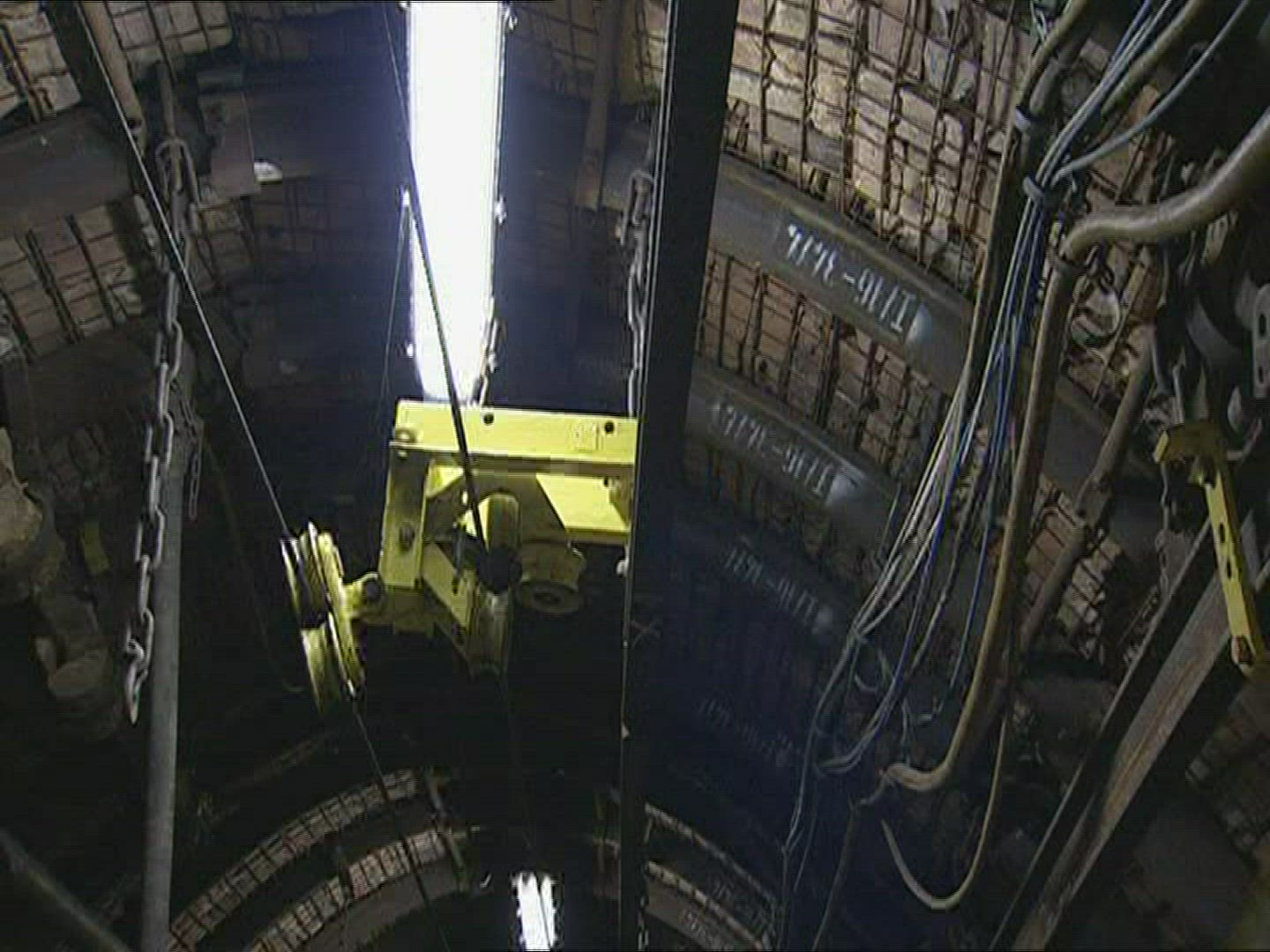 Slow motion steadicam shot of a dark ceiling with pipes and small lamps hanging on long metal sticks