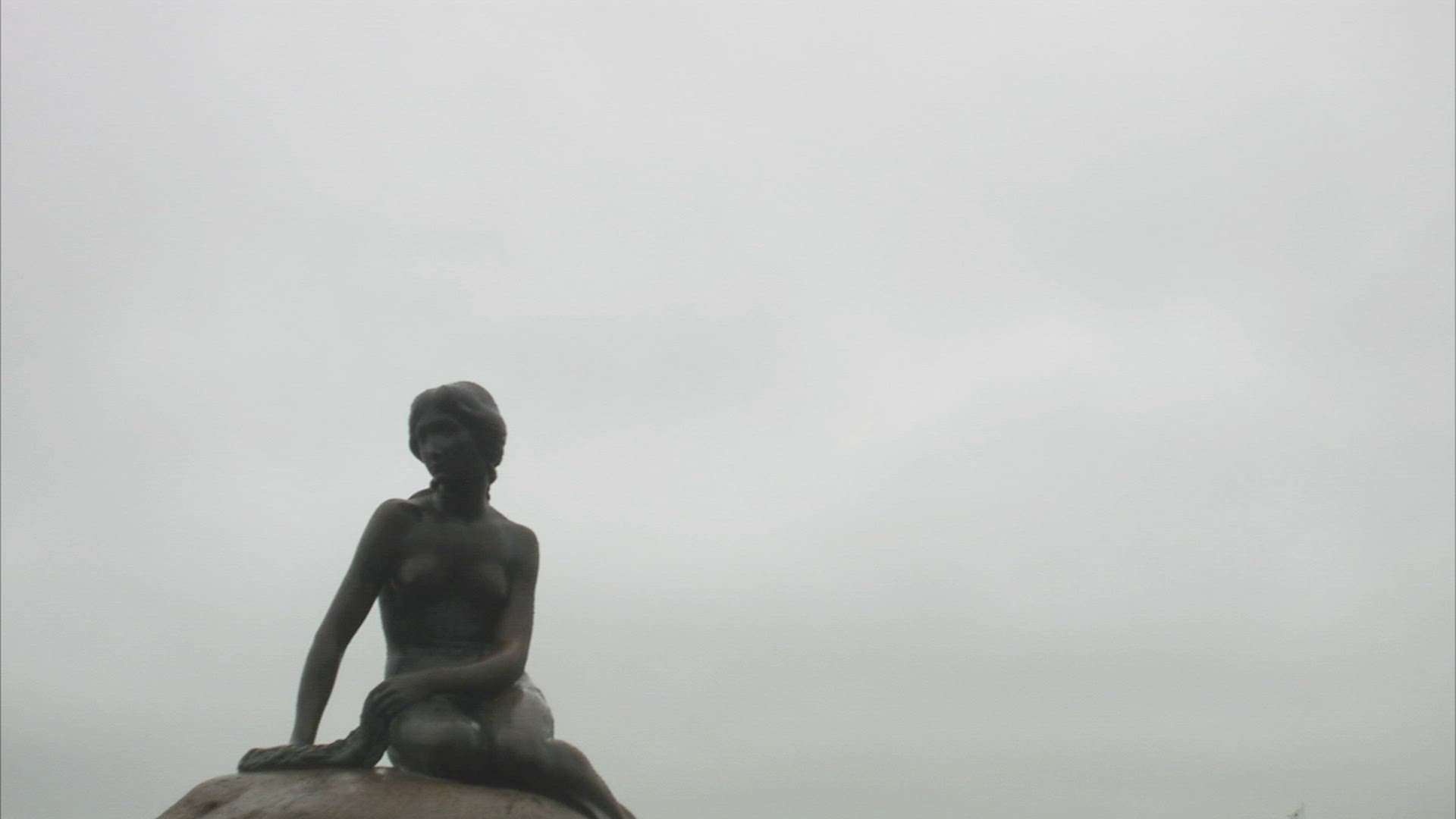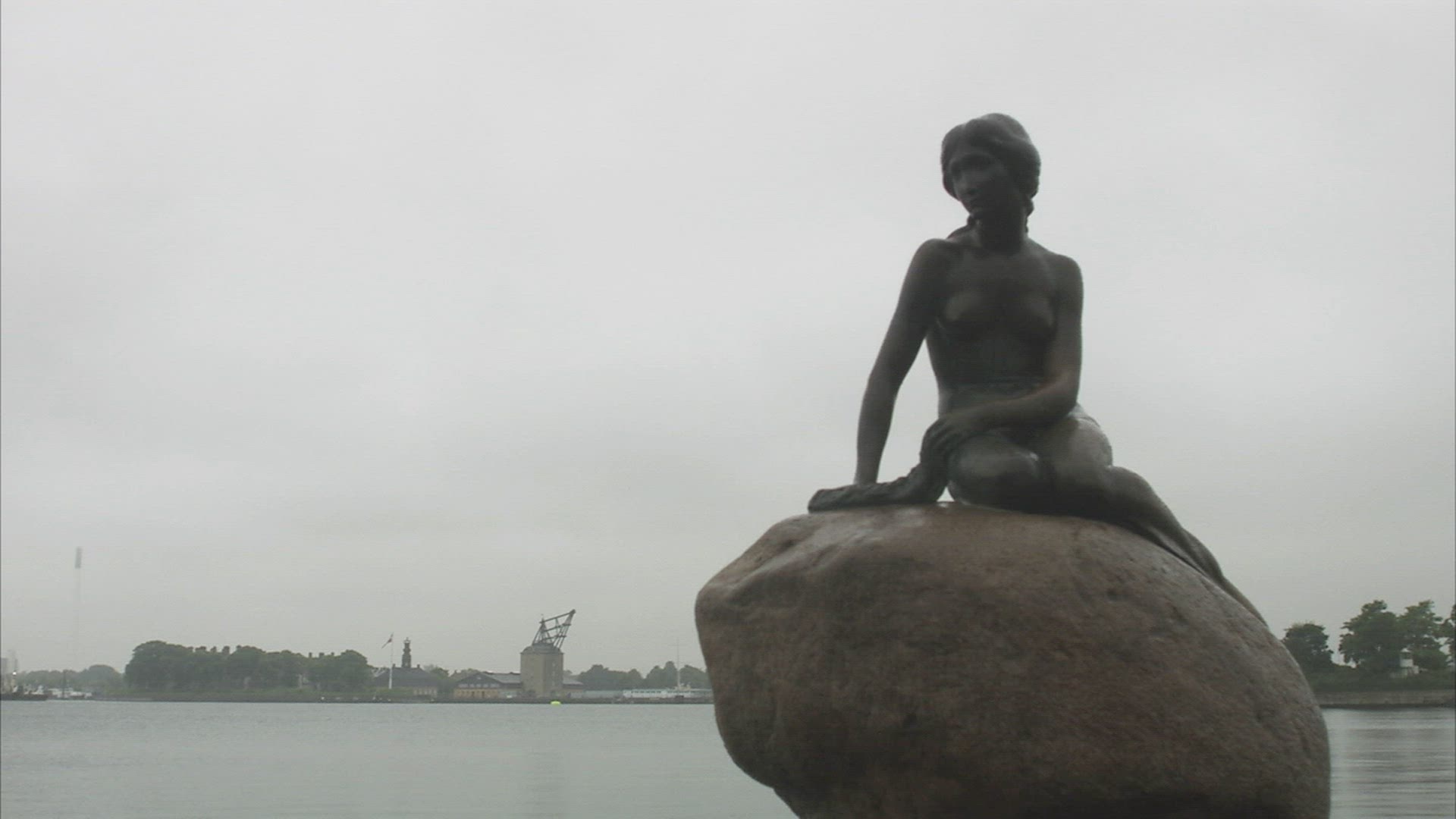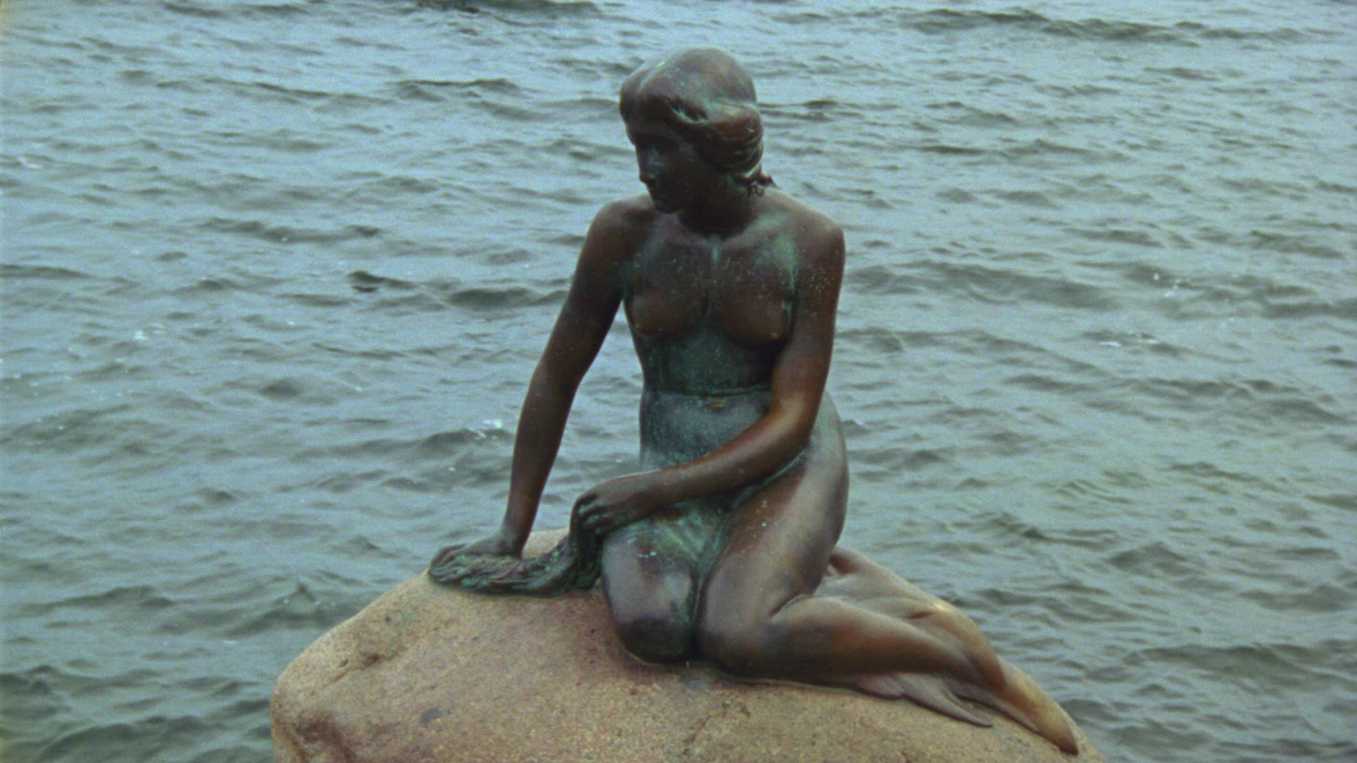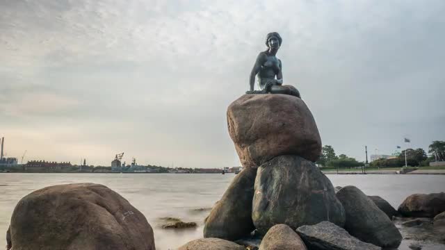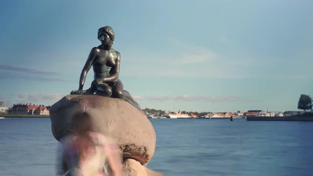 Slow motion of rippling water with golden sun reflection and The Little Mermaid statue on the stone in foreground. Copenhagen, Denmark