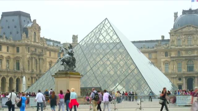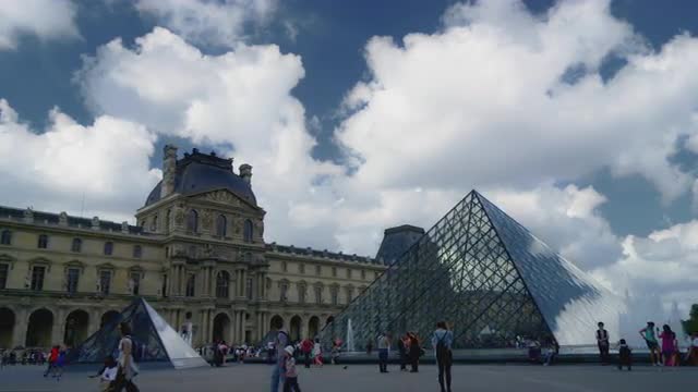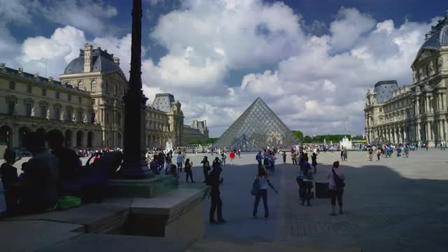 Hyperlapse shot of tourists and visitors walking around the Louvre area and coming into the Pyramid, main entrance of the museum