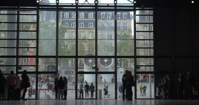 PARIS, FRANCE - SEPTEMBER 04, 2015: Timelapse shot of people traffic in the hall of Centre Georges Pompidou. Visitors at main entrance, information desk and break area