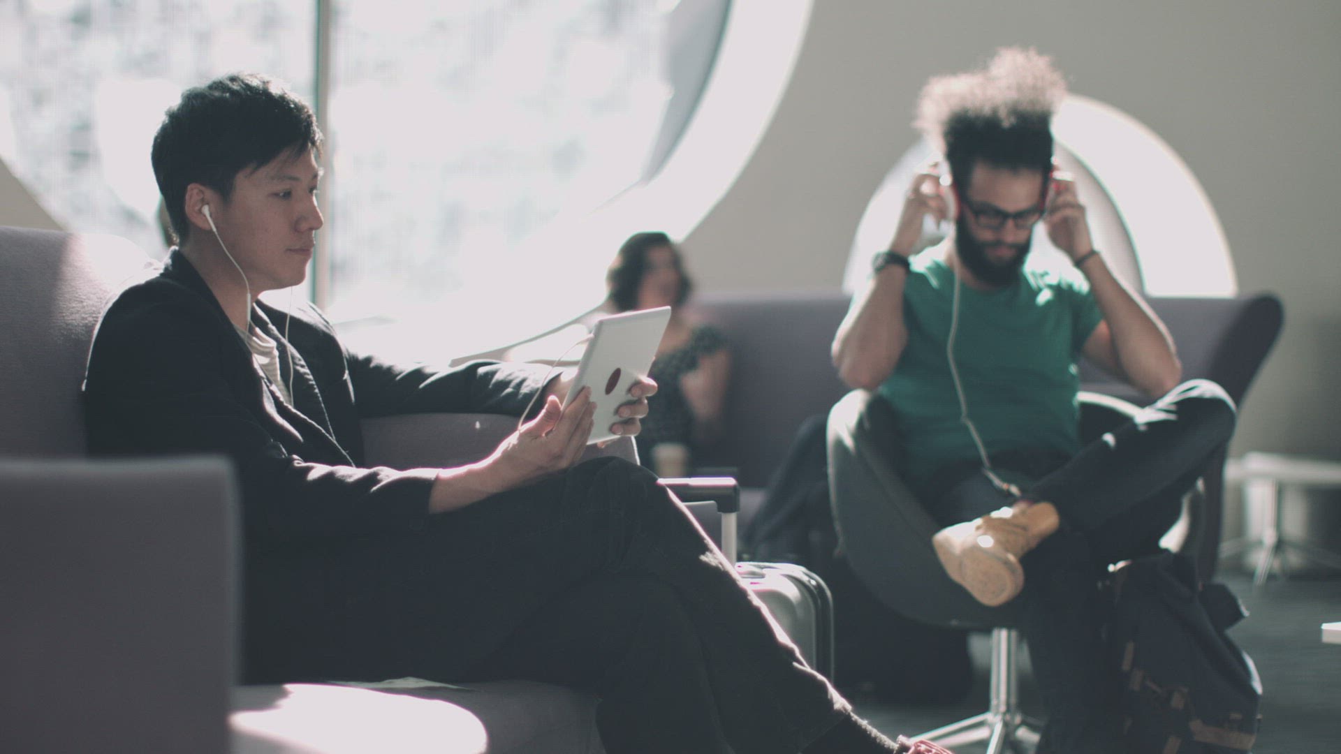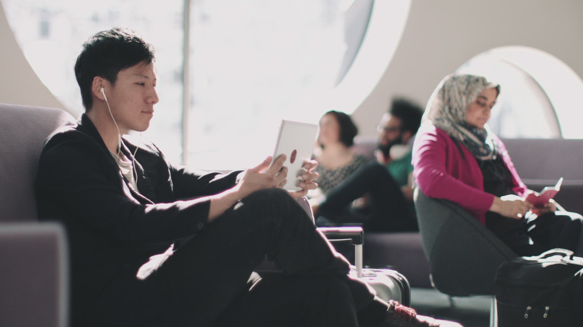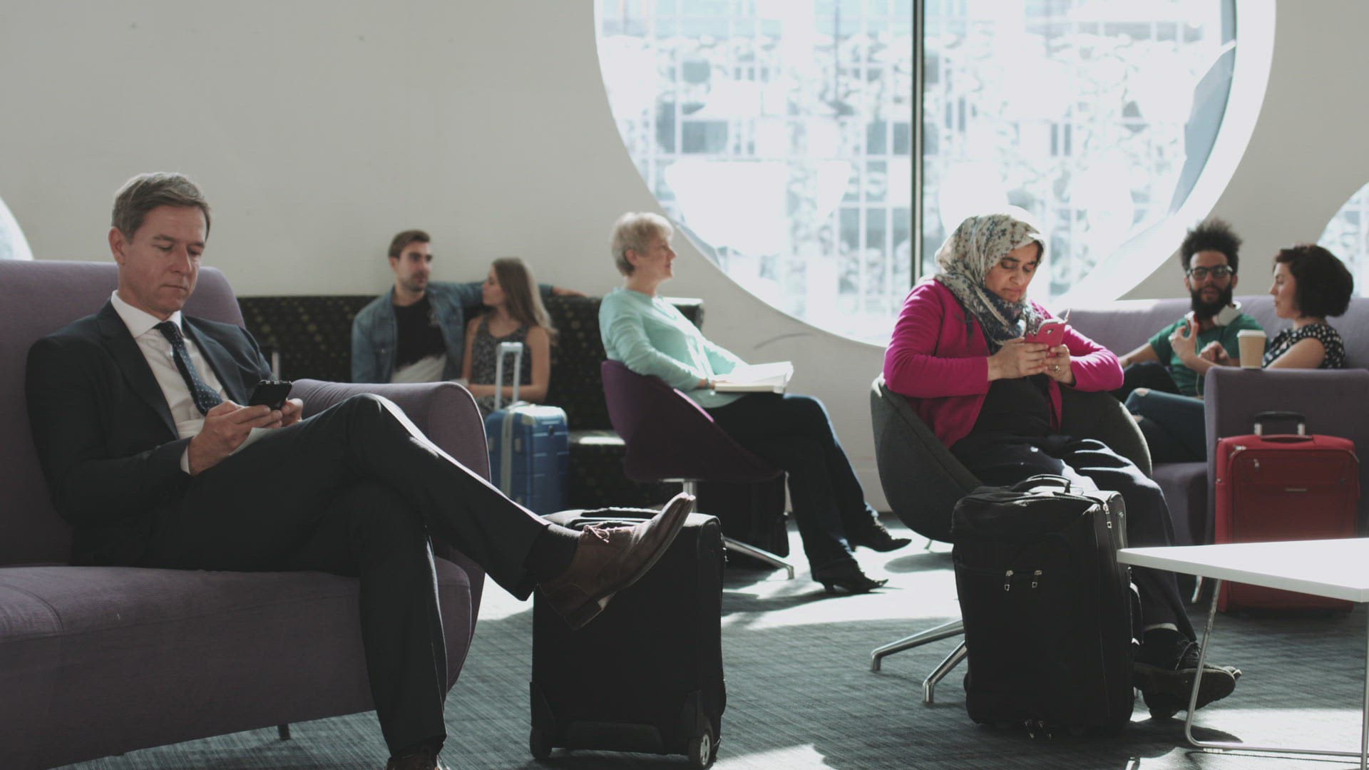 MOSCOW, RUSSIA - JULY 19, 2015: People waiting and walking in lounge of Vnukovo airport. Passengers silhouettes against huge panoramic window with view to planes