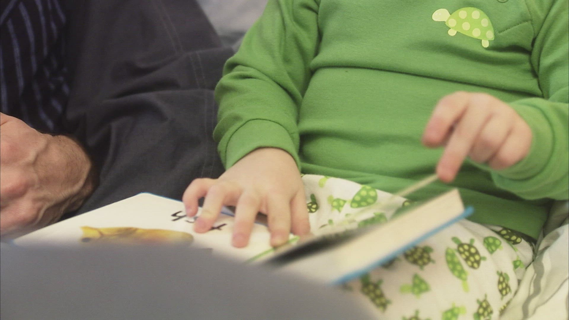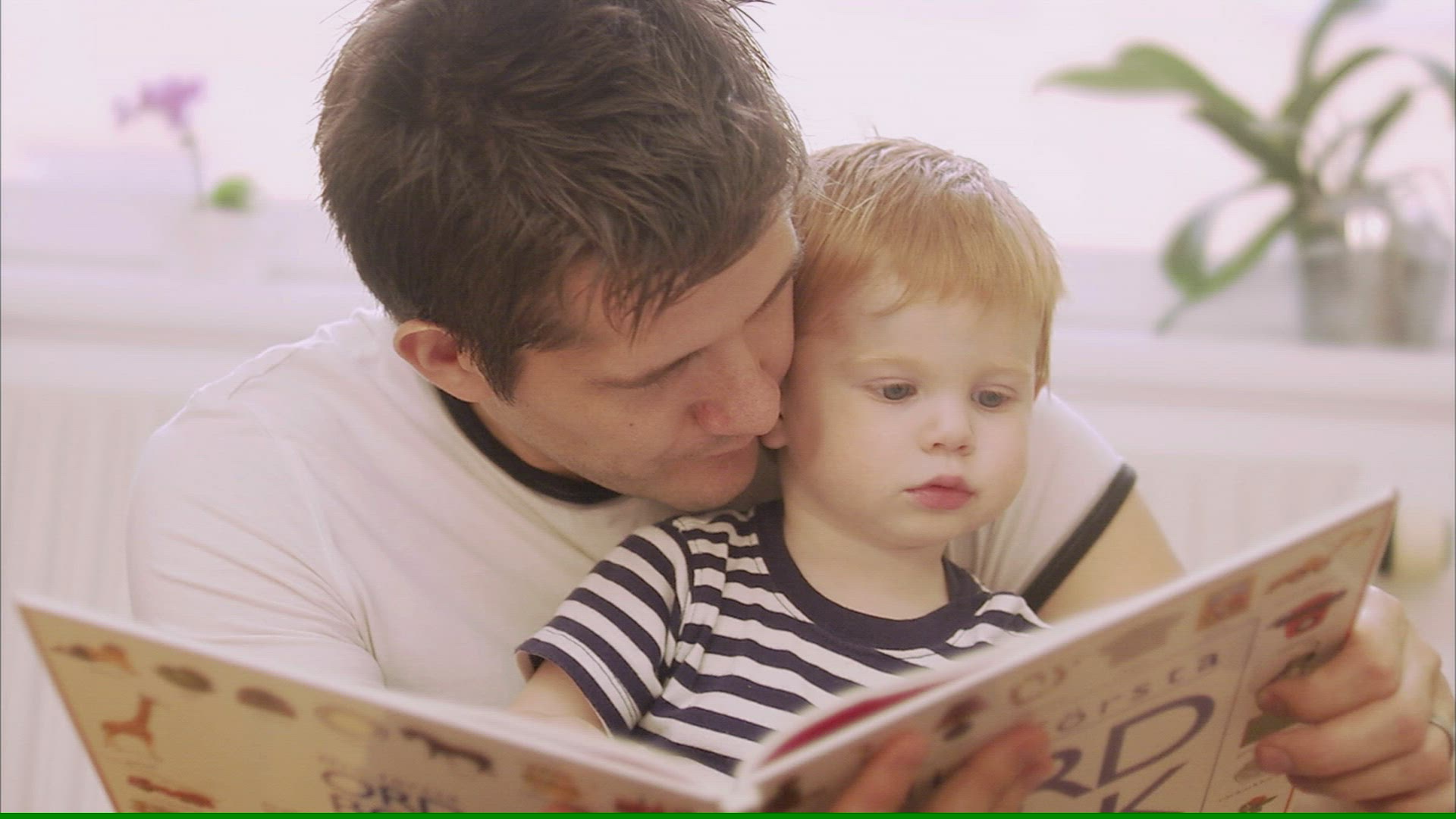 PEREA, GREECE - AUGUST 12, 2015: Young father and little son spending leisure time on the balcony. Father reading story to child and showing pictures in the book