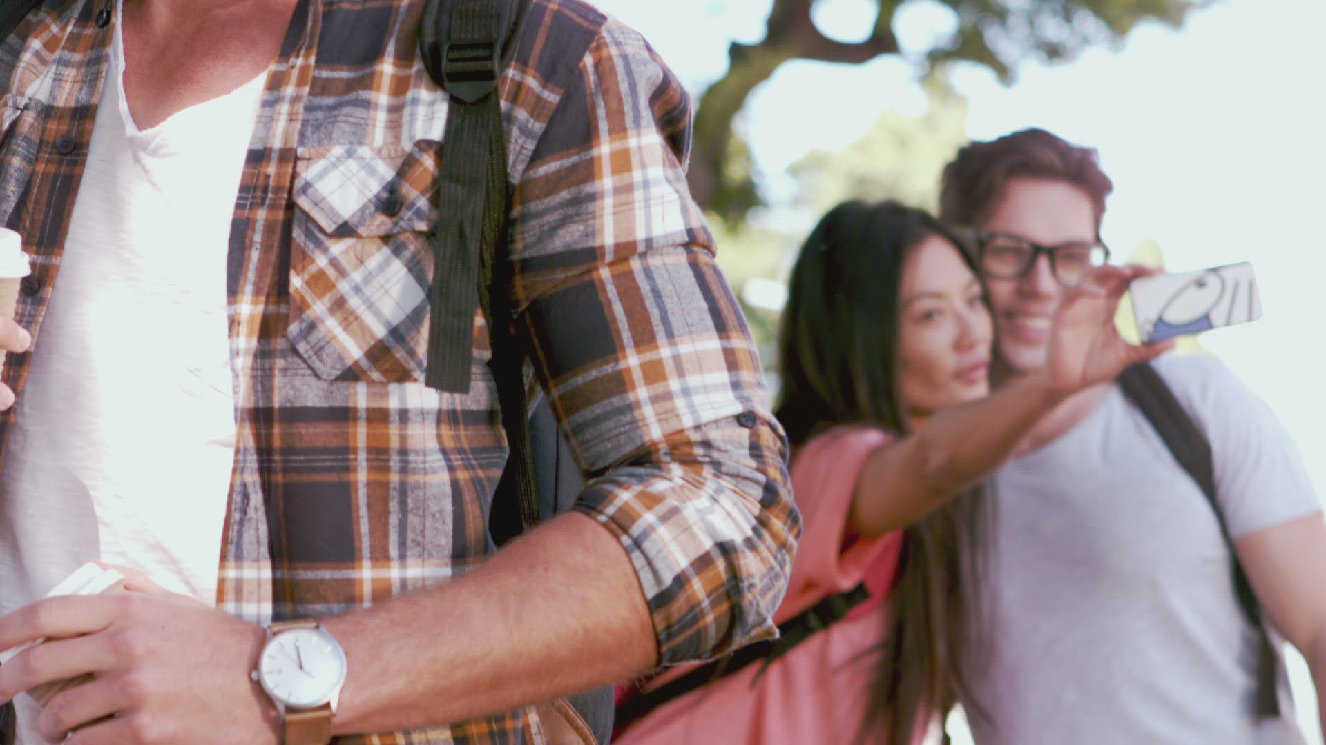 > Friends with coffee making selfie and laughing at photo