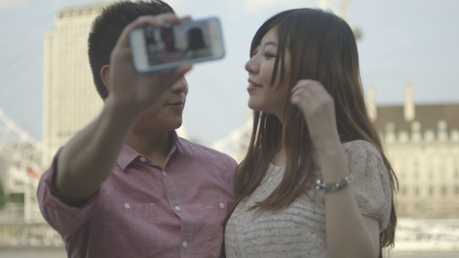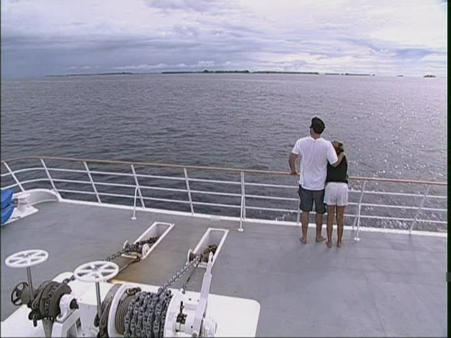 Young couple traveling by ship. They sitting on the deck and making selfie with mobile. Then looking at shots. Bright sun shining over the sea
