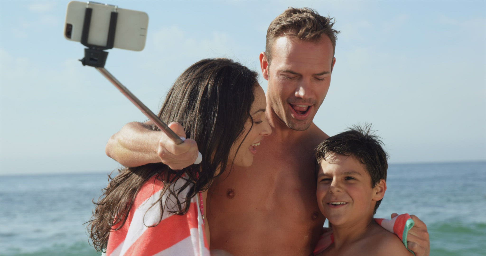Happy young mother and little son in hats and sunglasses taking selfie on cell while traveling by sea. Then they looking through the photos