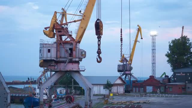 Cargo ship sailing in the sea near coastal city. Freight traffic by water