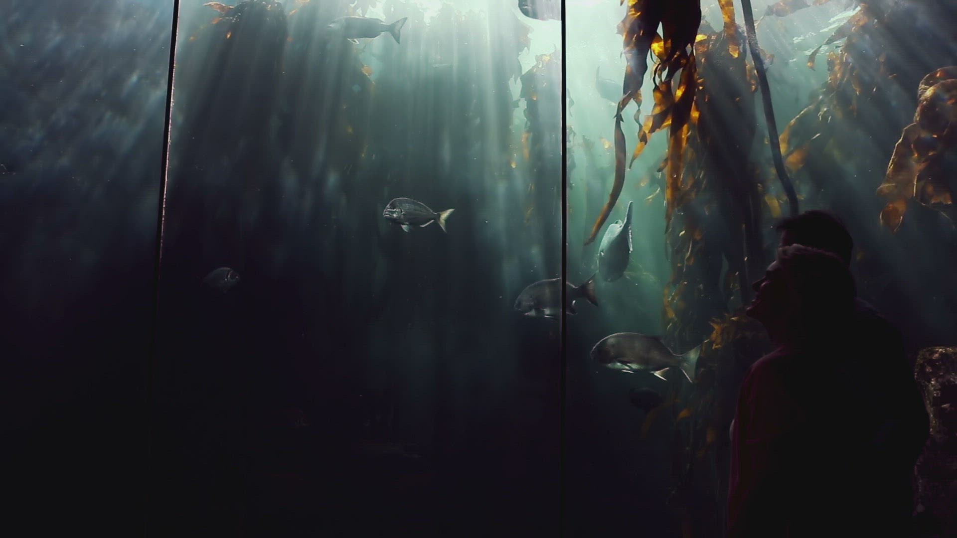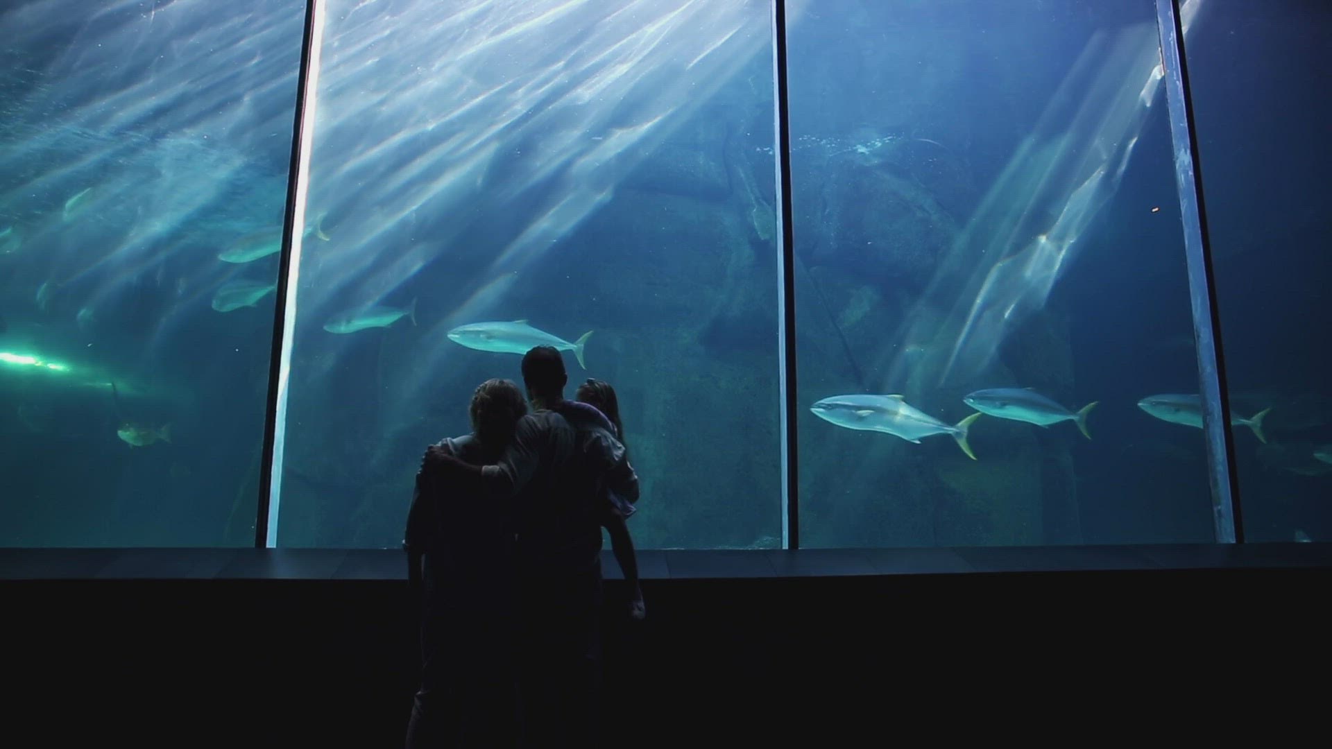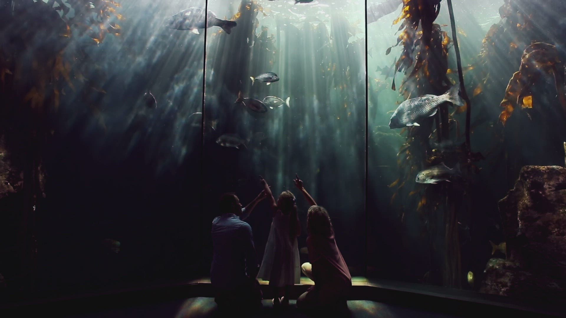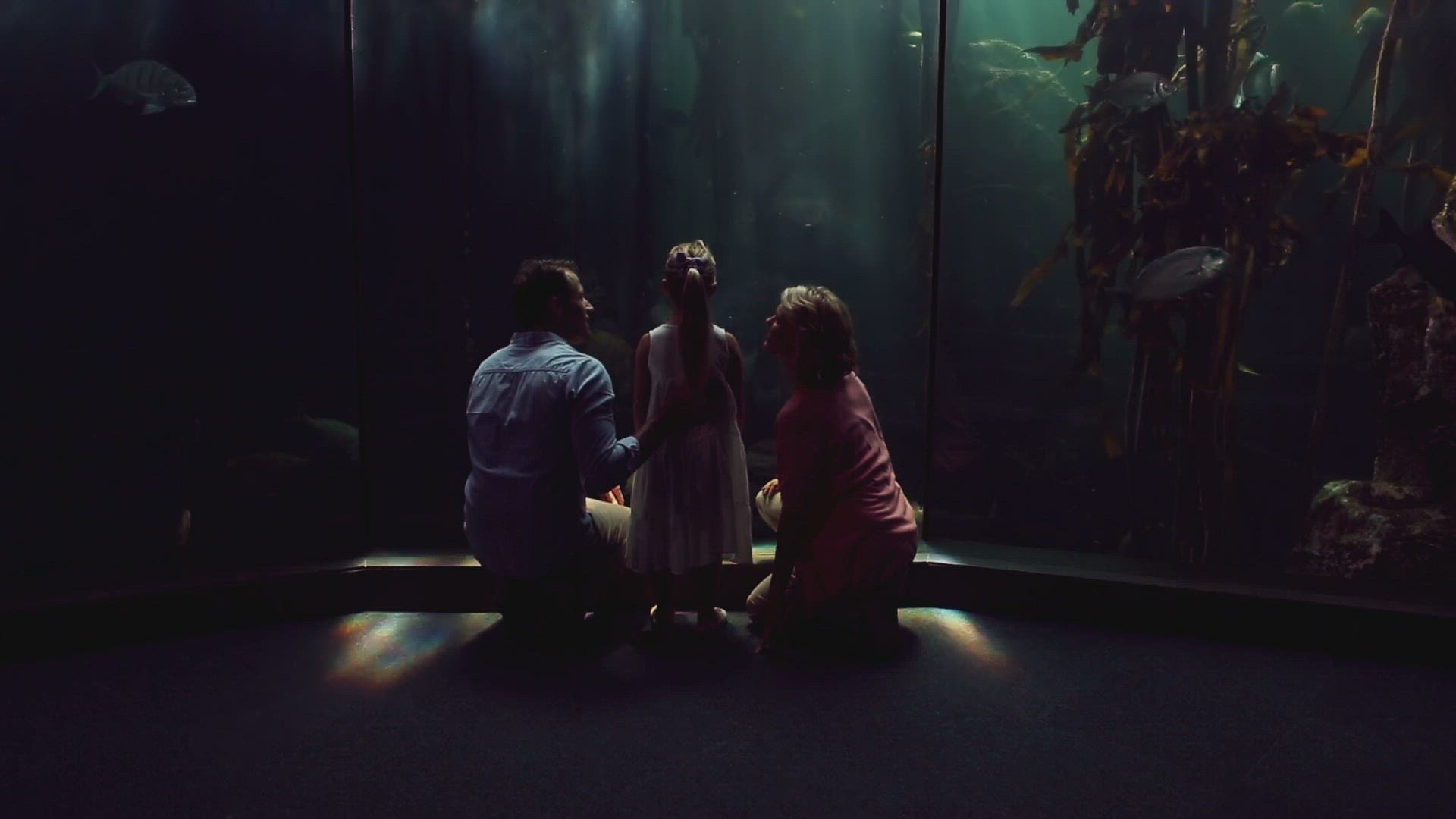 Steadicam shot of parents and child watching golden fish in aquarium exhibited in showcase of the street store