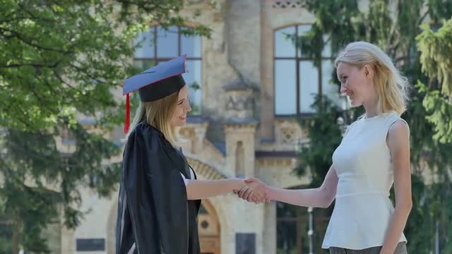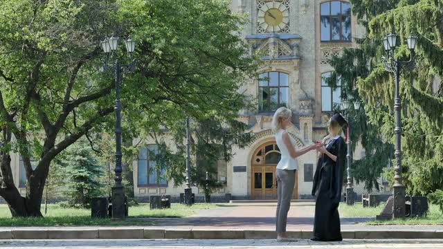 > Graduand in Mantle Demonstrating Her Diploma Smiling Standing in Alley Outside the Univesrsity Happy