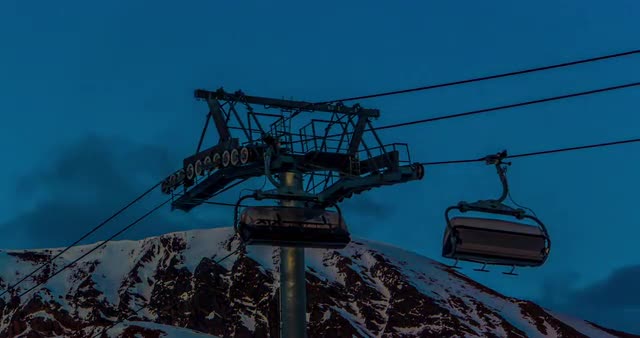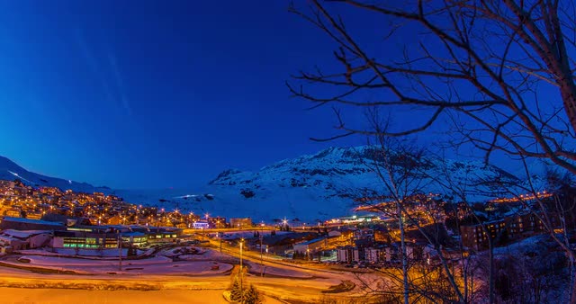 > AT skis rest under moonlight at an alpine hut in the Canadian Rockies backcountry.