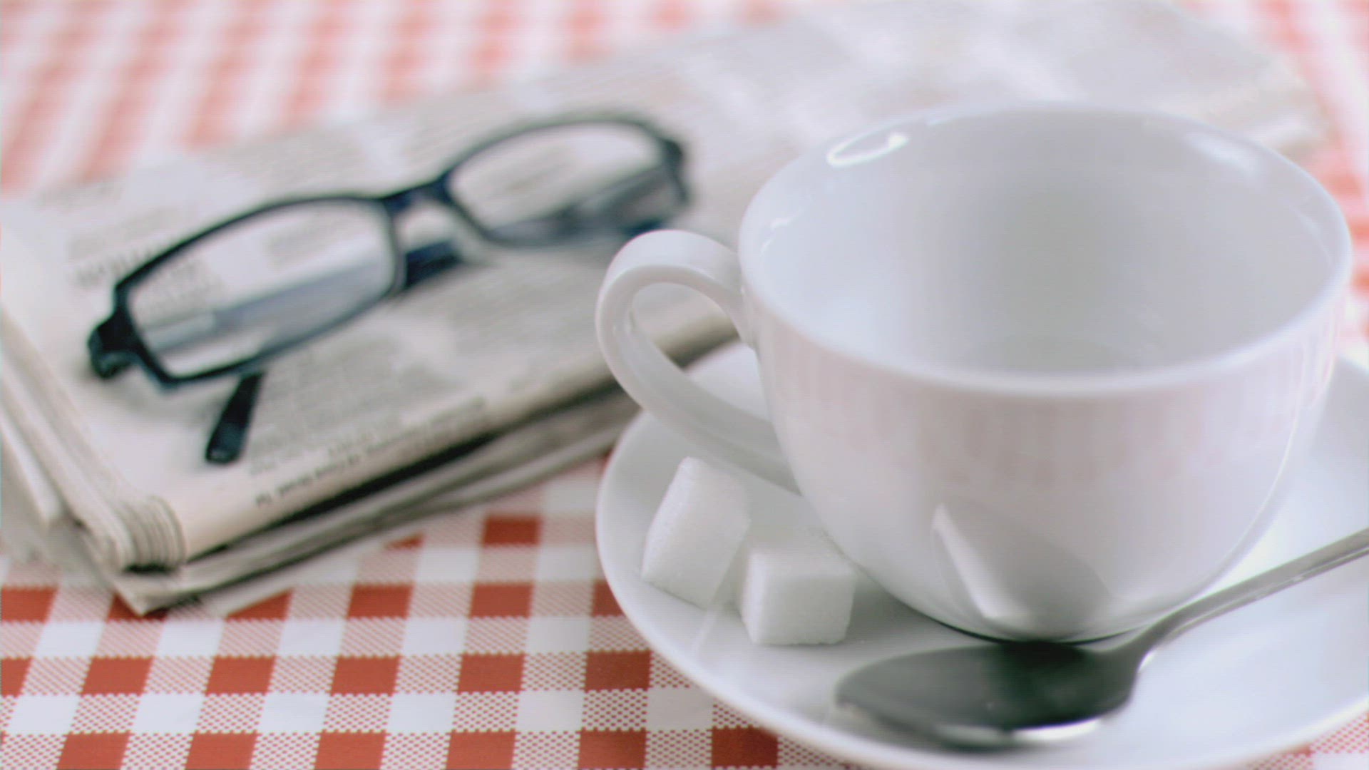 674770 - Table is served with a cup of coffee with foam and a drawing, then put sugar in cup