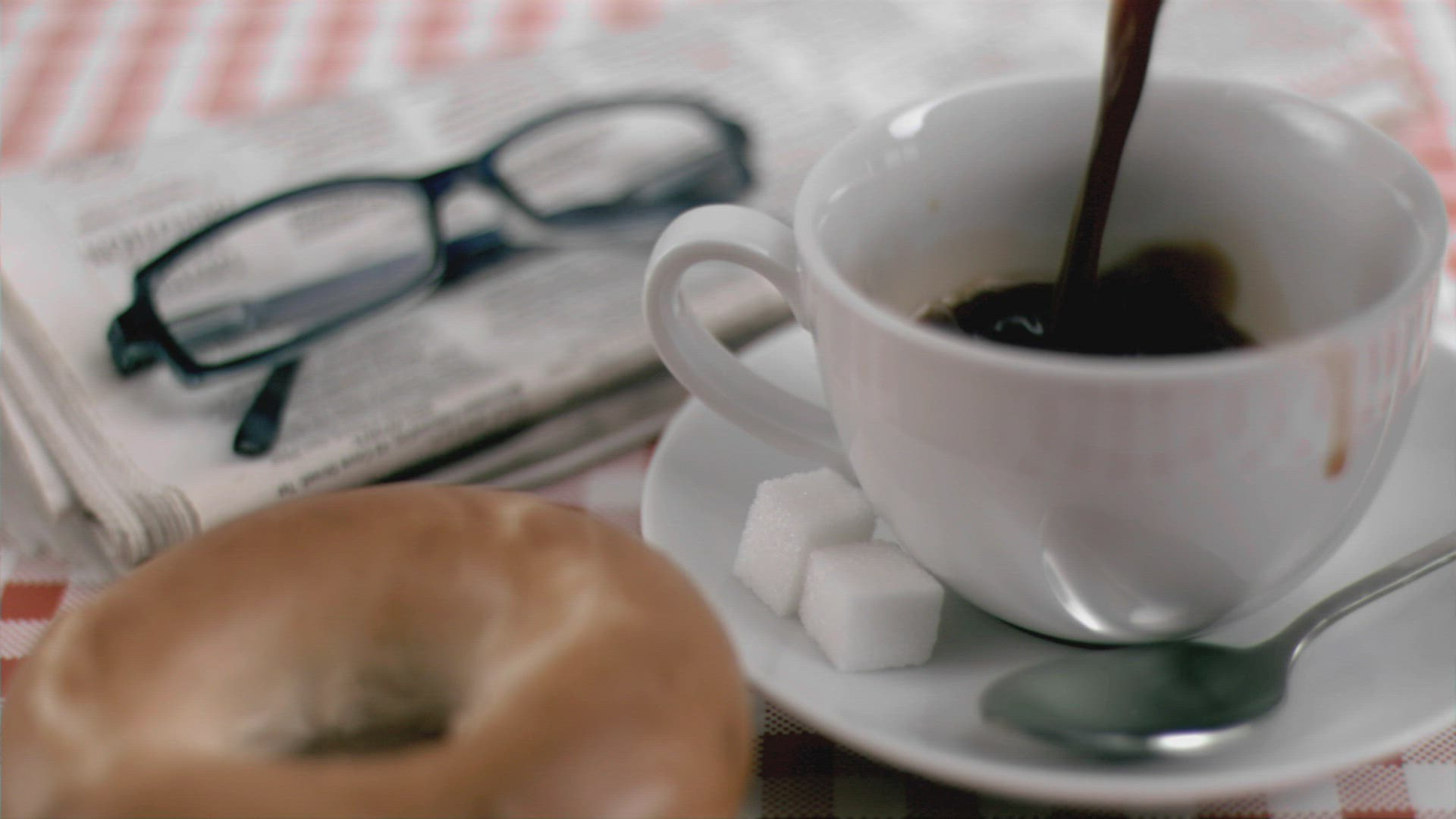 674765 - In a cup of coffee with foam girl pours sugar and stirs coffee with a spoon