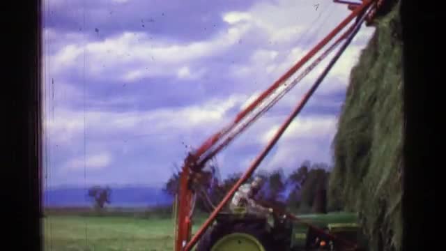 1957: Tractor moving haystack long armed farming machine building high pile. BATON ROUGE, LOUISIANA
