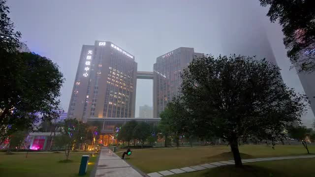> evening light guangzhou city office building backyard 4k time lapse china