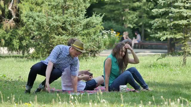 Couple Girl is Eating Sandwich on a Lawn Talking Smiling Couple at the Picnic Man and Woman Sitting