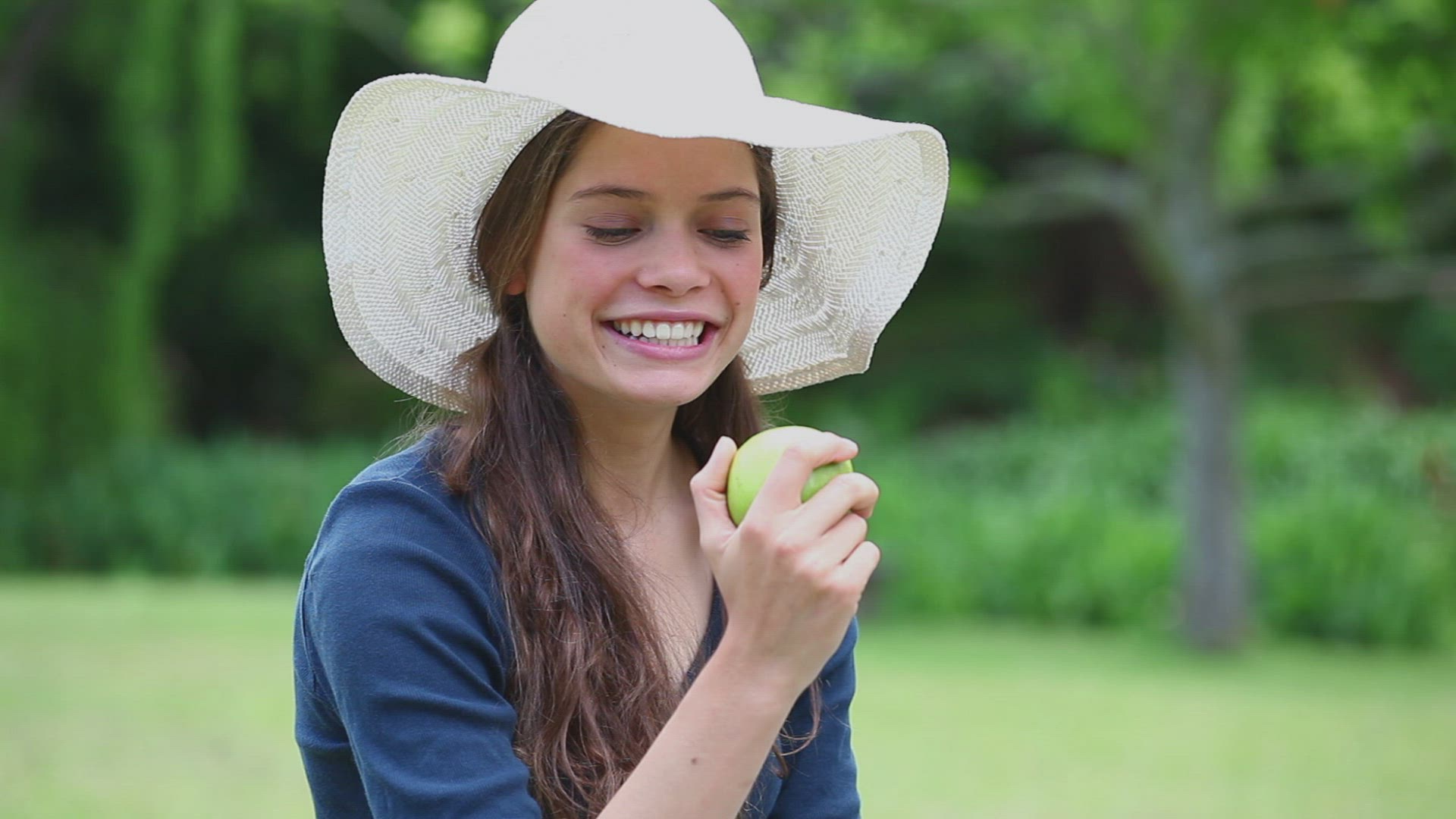 Young Man is Eating an Apple and Smiling Outdoors. Willow Tree Branches Are Swaying at the Wind. Guy in Checkered Shirt and Hat Bites Green Apple and Looking at Camera in Sunny Summer Day, Satisfied Happy Man in Park at the Nature